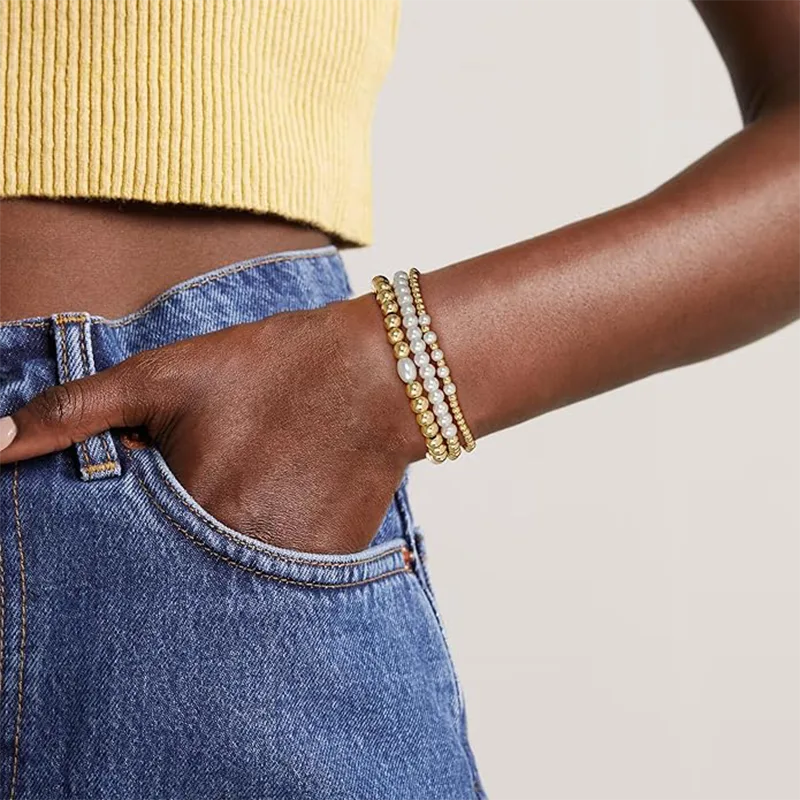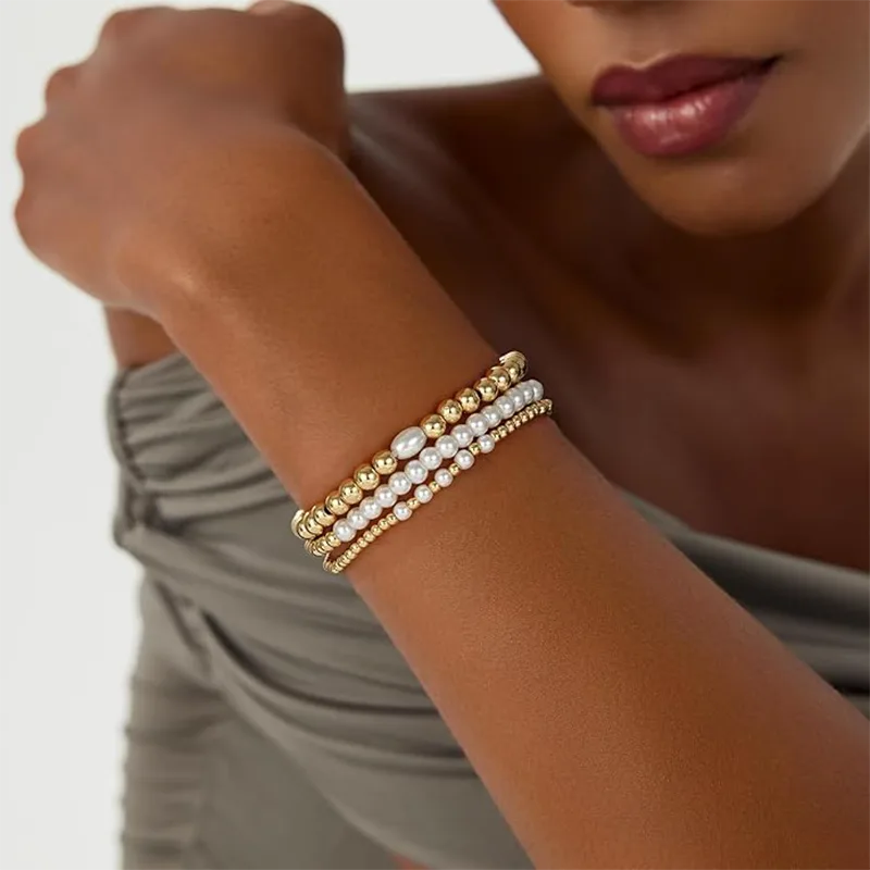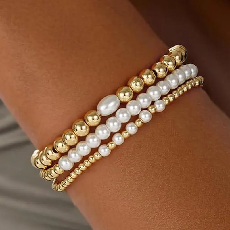 Способ ношения: Женские браслеты с жемчужными бусинами содержат 3 модных золотых браслета. Каждый золотой браслет можно носить отдельно, парами или в сочетании с другими браслетами. Разнообразные способы ношения подойдут ко всем вашим стилям одежды.